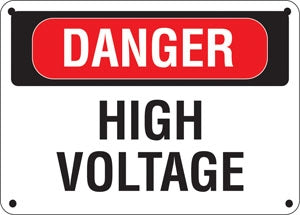 Sign says, "DANGER HIGH VOLTAGE" Message printed on one side Pre-punched corner holes for easy mounting Color: Red and Black on White Material: .0...