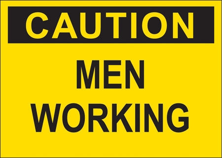 Decal says, "CAUTION MEN WORKING" Single Sided Peel and Stick Decal Color: Black on Yellow Material: Vinyl Size: 10"w x 7"h