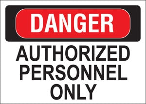 Decal says, "DANGER AUTHORIZED PERSONNEL ONLY" Single Sided Peel and Stick Decal Color: Red and Black on White Material: Vinyl Size: 10"w x 7"h