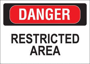 View full detailsDecal says, "DANGER RESTRICTED AREA" Single Sided Peel and Stick Decal Color: Red and Black on White Material: Vinyl Size: 10"w x 7"h