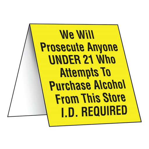 Sign says, "We Will Prosecute Anyone UNDER 21 Who Attempts To Purchase Alcohol From This Store I.D. REQUIRED"Message printed on both sides2 sided A...