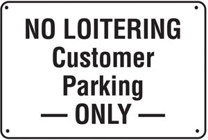 View full detailsSign says, "NO LOITERING Customer Parking -ONLY-" Message printed on one side Pre-punched corner holes for easy mounting Color: Black on White Mat...