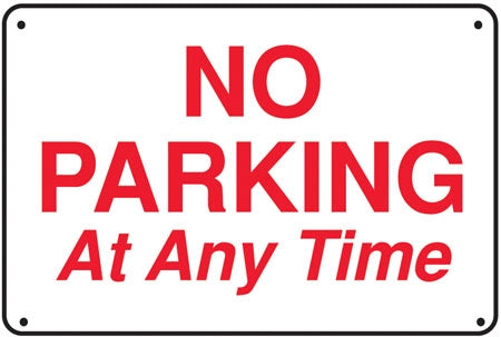 View full detailsSign says, "NO PARKING At Any Time" Message printed on one side Pre-punched top and bottom holes for pole or wall mounting Color: Red on White Mat...
