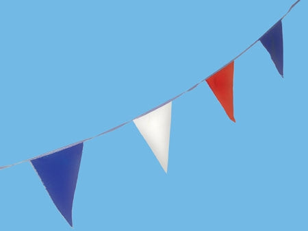 View full detailsThese Red, White and Blue pennants are made of heavy duty Plasti-Cloth nylon, and screen printed with color fast ink. Double sewn with grommets, ea...