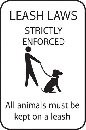 - Sign states "Leash Laws Strictly Enforced All animals must be kept on a leash."