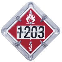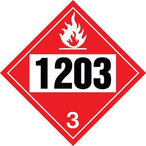 Black and White On Red. Styrene Placard states "1203". White border 1/2" from edge to meet CFR 49 standards. Works Great with our Aluminum Slide-I...
