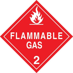 Decal says, "FLAMMABLE GAS 2"Placards meet CFR 49 and are capable of withstanding, without deterioration 30 day exposure to open weather condition...