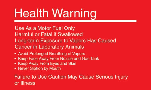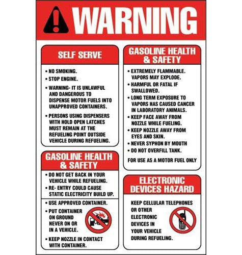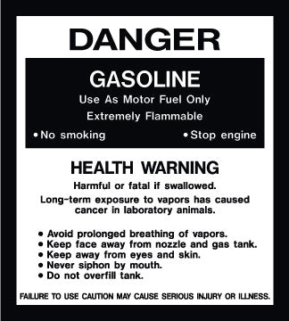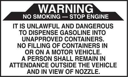 Decal says: "STOP ENGINE NO SMOKING (SYMBOL) DO NOT LEAVE PUMP WHILE FUELING GASOLINE SAFETY & HEALTH WARNING IT IS UNLAWFULL AND DANGEROUS TO ...