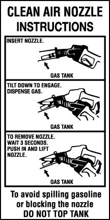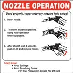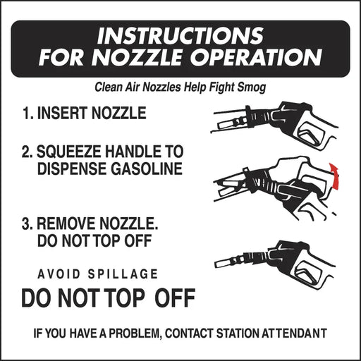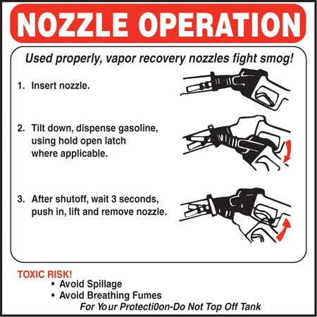 View full detailsDecal says, "NOZZLE OPERATION Used properly, vapor recovery nozzles fight smog! 1. Insert nozzle. 2. Tilt down, dispense gasoline, using hold open ...
