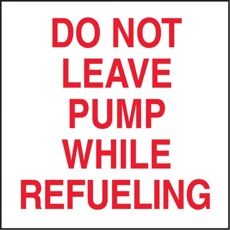 View full detailsDecal says, "DO NOT LEAVE PUMP WHILE REFUELING" Single Sided Peel and Stick Decal Color: White on Black Material: Vinyl Size: 6"w x 6"h