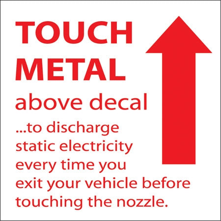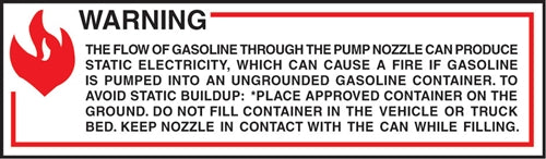 Decal says, "WARNING STATIC ELECTRIC SHARK EXPLOSION HAZARD (SYMBOL) NEVER fill portable containers that are in or on vehicle. (SYMBOL) ALWAYS plac...