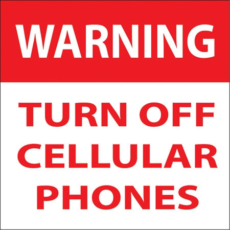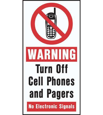 View full detailsDecal says, "WARNING Turn Off Cell Phones and Pagers No Electronic Signals" Single Sided Peel and Stick Decal Color: Red and Black on White Materi...