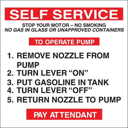 View full detailsDecal says, "SELF SERVICE STOP YOUR MOTOR - NO SMOKING"Size: 8"w x 8"h