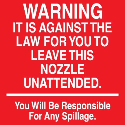 Decal says, "WARNING IT IS AGAINST THE LAW FOR YOU TO LEAVE THIS NOZZLE UNATTENDED. You Will Be Responsible For Any Spillage" Single Sided Peel an...