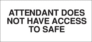 Decal says, "ATTENDANT DOES NOT HAVE ACCESS TO SAFE" Single Sided Peel and Stick Decal Color: Black on White Material: Vinyl Size: 13"w x 6"h