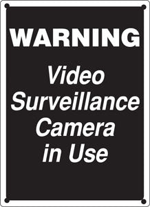 Sign says: "WARNING Video Surveillance Camera in Use" Message printed on one side Pre-punched corner holes for easy mounting Color: Black on White...