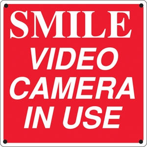 Aluminum Sign says: "SMILE VIDEO CAMERA IN USE". Pre-punched corner holes for easy mounting Message printed on one side Pre-punched corner holes f...
