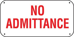 Sign says, "NO ADMITTANCE" Message printed on one side Pre-punched corner holes for easy mounting Color: Red on White Material: .040 Aluminum Size...