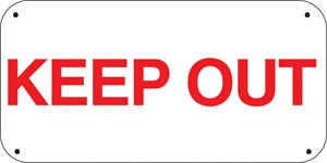 Sign says: "KEEP OUT" Message printed on one side Pre-punched corner holes for easy mounting Color: Red on White Material: .040 Aluminum Size: 16"...