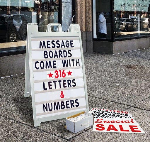 These folding marquee signs let you securely create and display custom messages up to 63 characters. With two ample sized letter boards per kit and over 300 letters, numbers and headers, you can quickly create or update your message. Built around a Signicade® all-plastic folding sandwich board, SignTrax™ Message Boards come pre-assembled with permanently attached tracks. Available from UnitedSign.