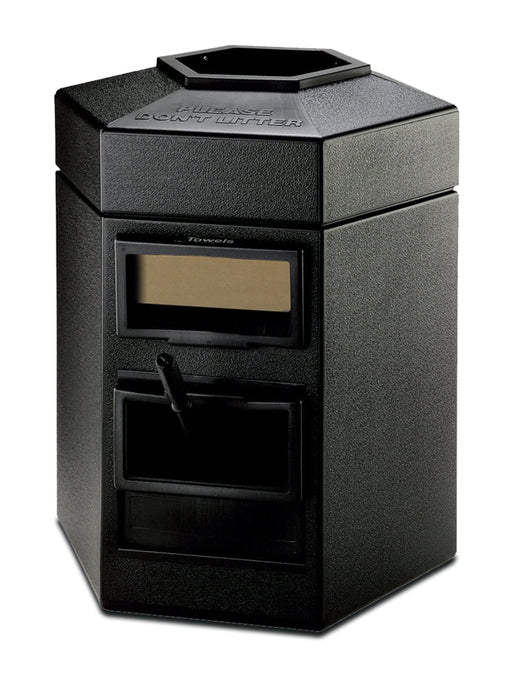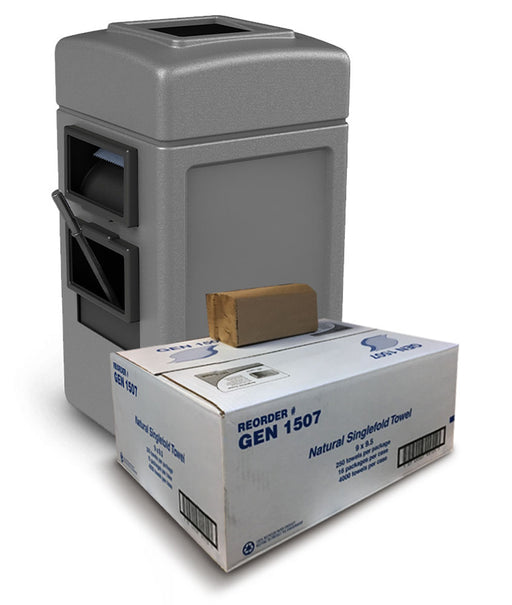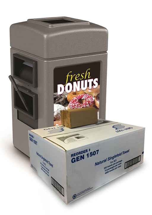 This generous 35 gallon hex shaped waste container is already an excellent pump island service center. Now we've bundled it with a case of Paper towels to fill it! It combines a 35-gallon trash capacity with the convenience of a built-in windshield service center. By shipping the Waste Container with the paper towels already inside it, you get the case shipped for FREE!