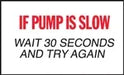 Decal says:, "IF PUMP IS SLOW WAIT 30 SECONDS AND TRY AGAIN"