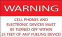 Decal says, "WARNING CELL PHONES AND ELECTRONIC DEVICES MUST BE TURNED OFF WITHIN 25 FEET OF ANY FUELING DEVICE"