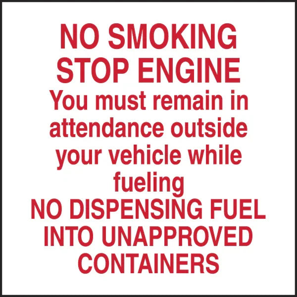 Decal says, "NO SMOKING STOP ENGINE You must remain in attendance outside your vehicle while fueling NO DISPENSING FUEL INTO UNAPPROVED CONTAINERS"