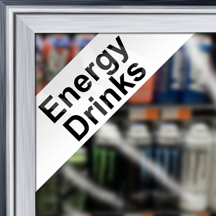 Attract attention without blocking the view! Designed to fit in corner, this cooler door decal says "Energy Drinks"