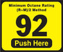 Non OEM vinyl decal replaces Wayne Vista fuel grade decals. Single Sided Peel and Stick Decal says: "Minimum Octane Rating... Push Here"